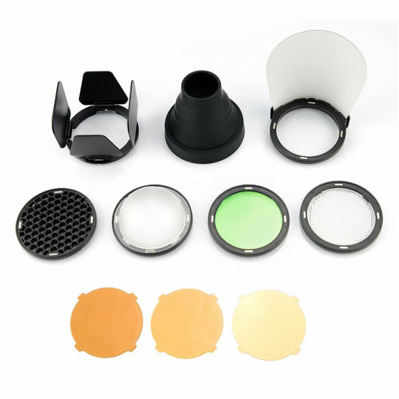Комплект насадок Godox AK-R1 представляет собой универсальный набор светоформирующих аксессуаров для профессиональной работы со вспышками. Этот комплект совместим с популярными моделями вспышек Godox, включая V1 и AD100Pro, а также с другими устройствами, оснащенными круглой головкой диаметром 75 мм. Все насадки имеют магнитное крепление, позволяющее быстро менять модификаторы света. В компактном жестком кейсе собраны восемь различных аксессуаров: рассеиватель-полусфера для мягкого освещения, плоский широкоугольный диффузор, четырехлепестковые шторки для контроля светового потока, регулируемый отражатель-флаг, сотовая решетка для направленного света, резиновый снут-тубус, а также набор фильтров — оранжевые конверсионные и зеленый. Комплект весит всего 360 грамм и занимает минимум места благодаря продуманной упаковке размером 18×10×5 см. Система позволяет быстро адаптировать освещение под любые задачи.