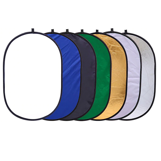 Grifon R7‑1218 — универсальный набор овальных лайт‑диск отражателей размером 120×180 см для контроля света на съемке. В комплекте 7 рабочих поверхностей: белая, черная, серебристая, золотистая, полупрозрачная просветная, а также синий и зеленый ChromaKey. "Просветный" смягчает жесткий поток, "белая и серебристая" стороны помогают заполнять тени и формировать акцентный рисунок света, а "черная" — гасит паразитные цвета и углубляет тени, этого можно достичь отсекая ненужный свет от объекта съемки. Сине‑зеленый чехол типа ChromaKey позволяет снимать с последующей заменой фона в постобработке, чаще выбирают зеленую сторону, синюю выбирают, если в элементах объекта съемки есть зеленый цвет. Прочный пружинный каркас складывается до компактного круга диаметром около 62 см. Это самый большой отражатель для ручной работы в нашем прокате, больше только комплект рамы Manfrotto Pro Scrim All In One Kit 2x2m.