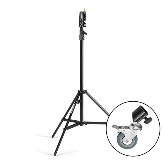 Manfrotto 008BSU — это стальная двухсекционная стойка-тренога (Cine Stand) с максимальной нагрузкой до 15 кг и высотой до 212 см, оснащенная колесами для быстрого перемещения света. Модель отличается исключительной устойчивостью благодаря низкой базе и двойным распоркам ножек, а универсальное крепление (гнездо 28 мм и выдвижной палец 16 мм) позволяет устанавливать любые приборы — от тяжелых моноблоков до систем с журавлями.